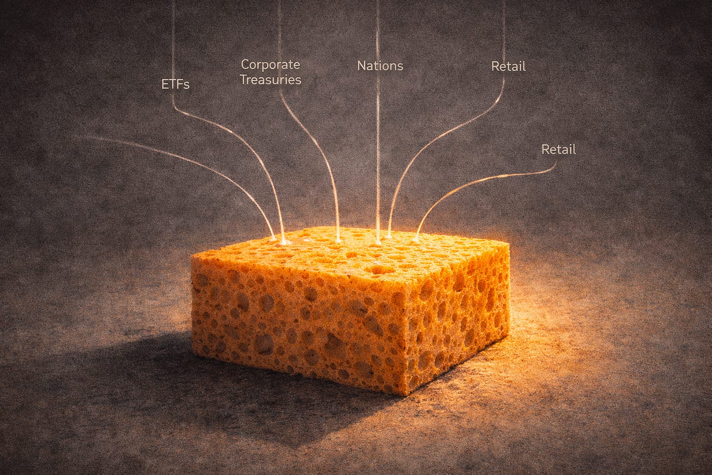 Think of Bitcoin as a sponge. As the financial system creates more and more liquidity — more debt, more credit, more units of currency — that liquidity needs somewhere to go. People and institutions exchange it for assets that they hope will preserve value: real estate, equities, bonds, gold, collectibles.