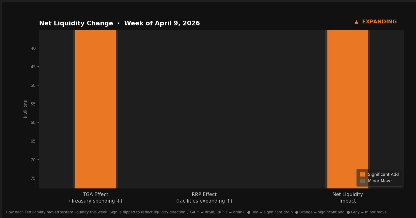 One week is still one data point. The pattern that matters is what happens over the next three weeks as April receipts either arrive in force or don’t. If the TGA stays suppressed, this becomes a genuine liquidity tailwind. If it rebounds steeply, the move reverses just as fast.
