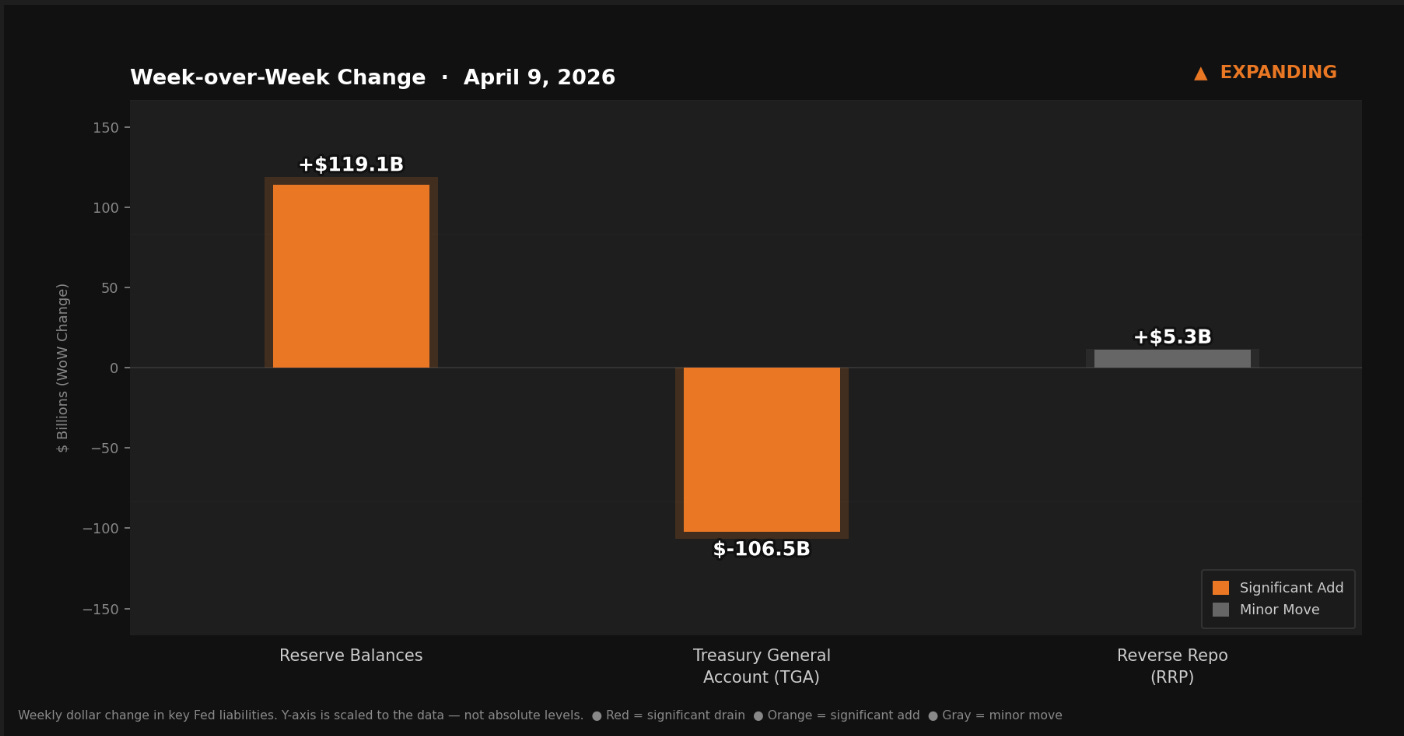 The accounting is directionally clean. The TGA shed $106.5 billion. Reverse repo absorbed a modest $5.3 billion of that inflow. Other balance sheet factors account for the remainder, and reserves landed $119.1 billion higher on the week. The Treasury spent. Banks received. Reserves expanded — at scale.
