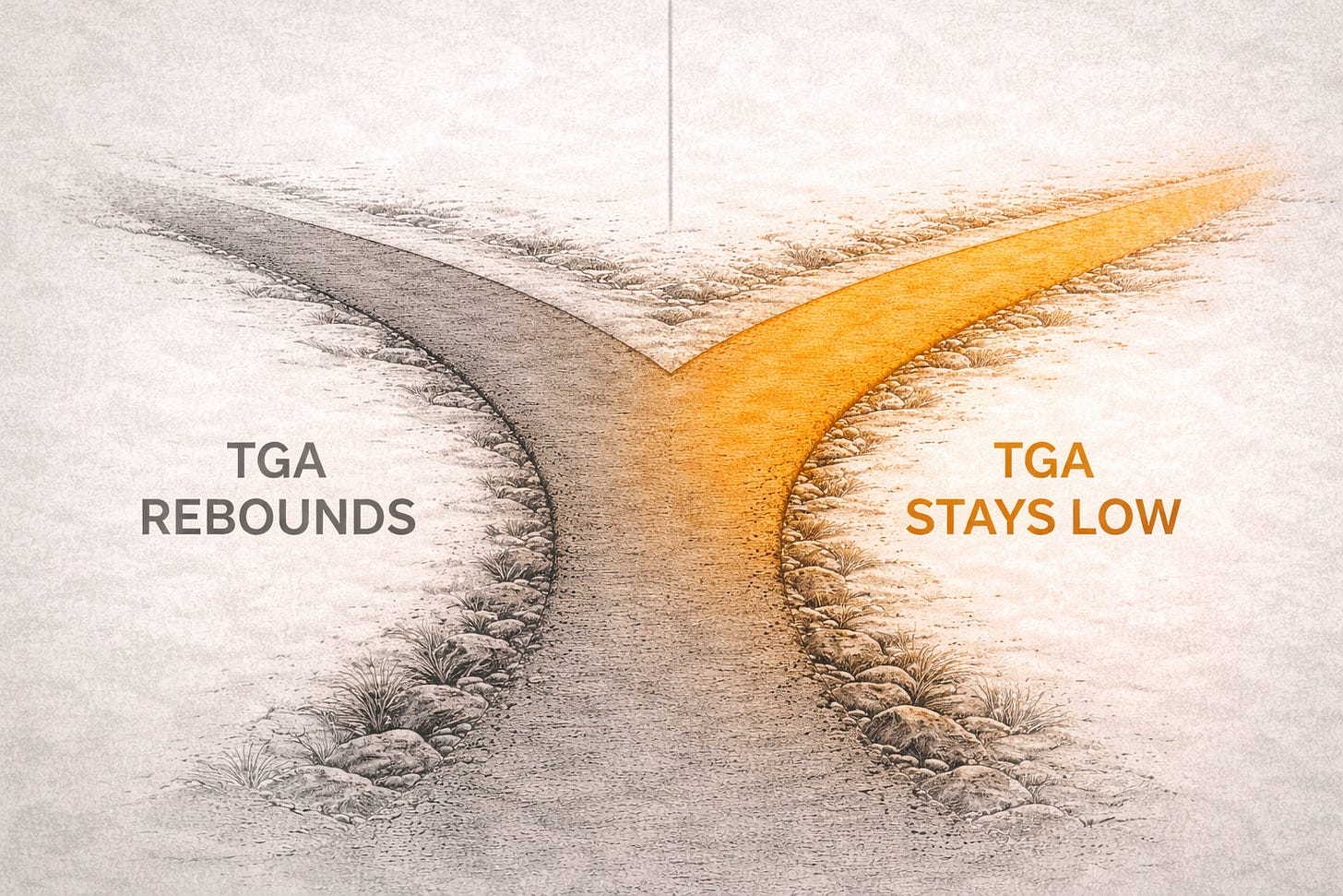The Treasury General Account (TGA) is the U.S. government’s operational bank account, also held at the Fed. When the government collects taxes or issues new debt, the TGA rises. When it spends, the TGA falls. The critical point: TGA movements are a direct counterweight to reserve balances. Every dollar that leaves the TGA enters the banking system as reserves. Every dollar that enters the TGA is pulled out of reserves. The Treasury is effectively a massive liquidity valve — and this week it moved hard.
