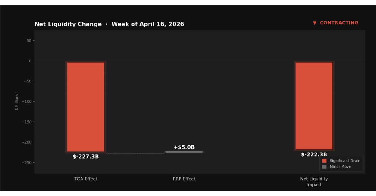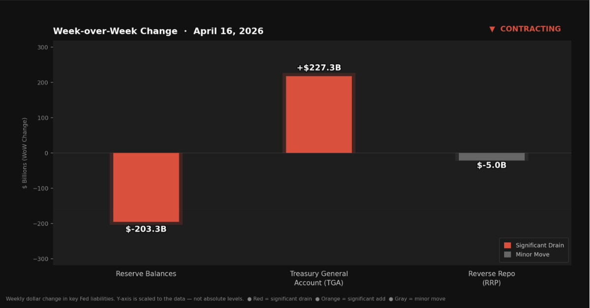 Primary Driver: The Treasury General Account surged $227.3B in a single week as April tax receipts arrived in full force, pulling $203.3B out of reserve balances.
