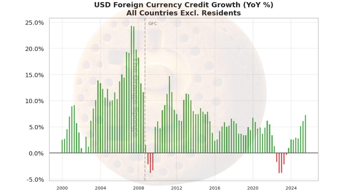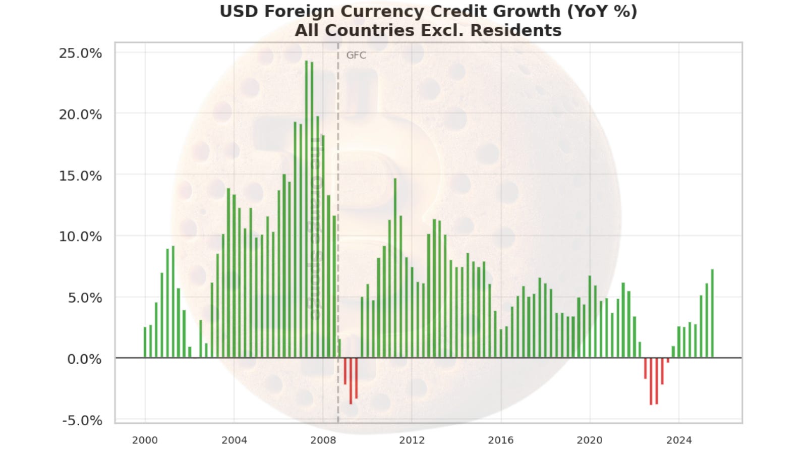 The Q3 2025 reading: the system was expanding again. The 2022–2023 contraction ended. Year-over-year growth is running around 5–7%. The global dollar credit machine, after its longest pause since the GFC, was back to doing what it has done for 25 years.