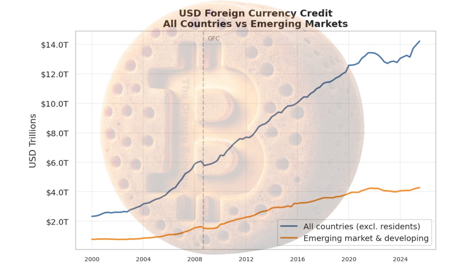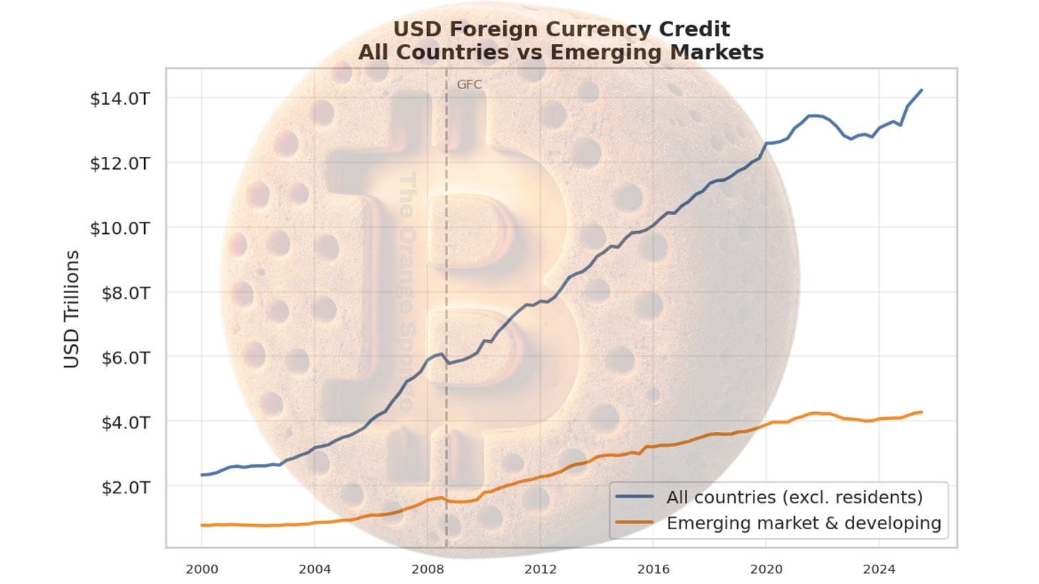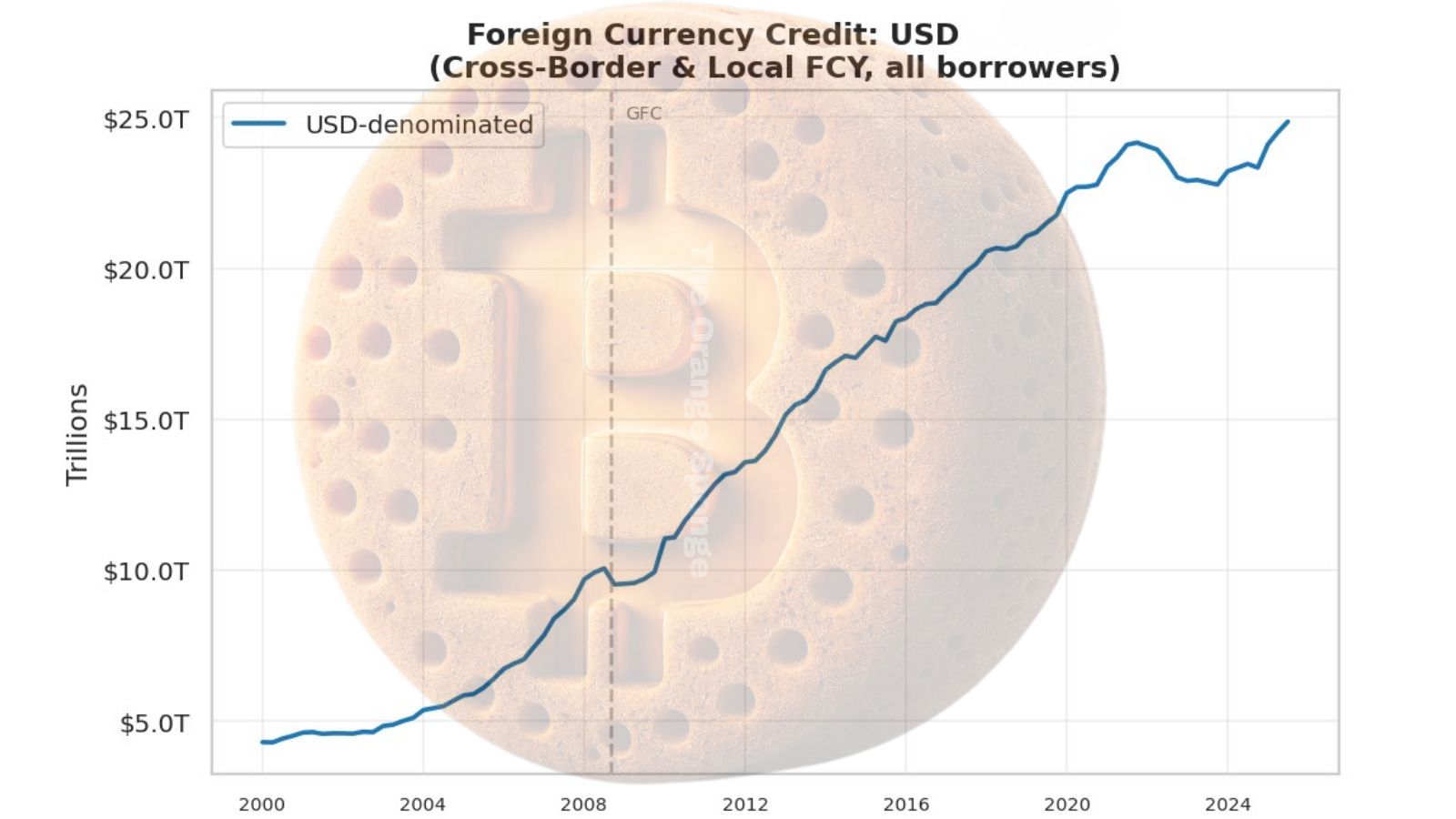 The growth story is the part worth sitting with. In 2000, USD foreign currency credit was approximately $5 trillion. In 25 years, it has grown fivefold. The world’s dollar debt has quintupled in a single generation.