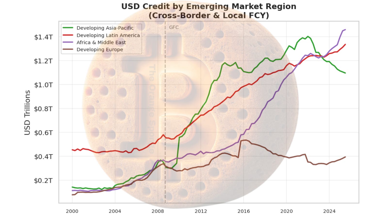 The number worth watching is Africa and the Middle East, which has grown sharply since 2015 and now converges with Latin America at approximately $1.2 trillion. This is the next frontier. The region’s rising dollar debt exposure is happening in parallel with some of the most rapid Bitcoin adoption anywhere in the world — which is exactly the sequence you’d expect to see if dollar dependency and Bitcoin appeal are related phenomena.
