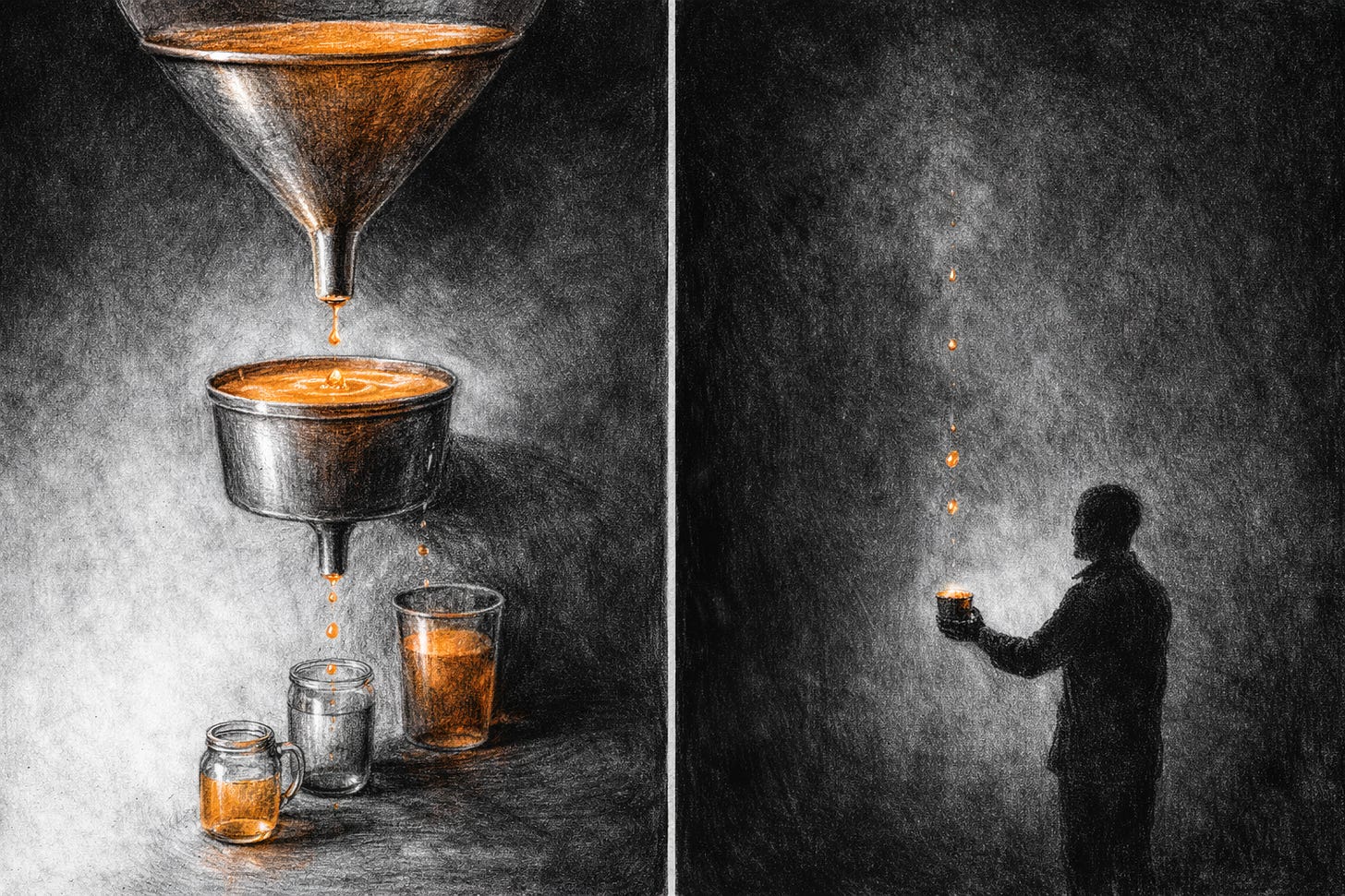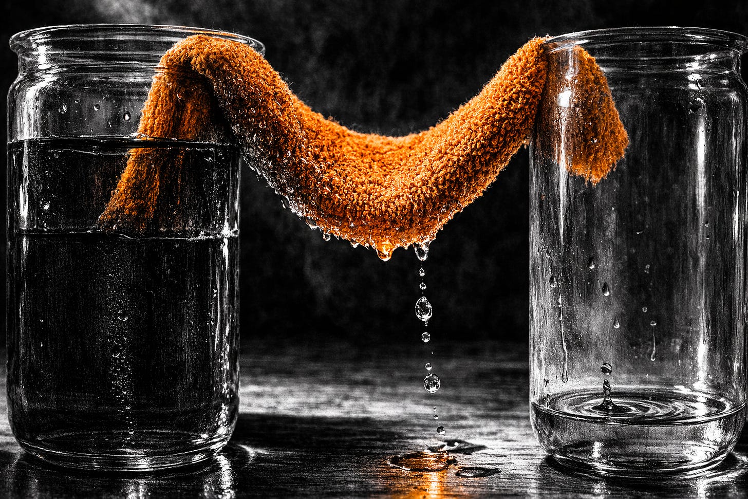 Place a towel between two cups of water — one nearly full, one nearly empty — and leave them alone. Over time, without any pump or mechanism or intervention, the dry cup slowly rises. Moisture migrates across the towel not because anyone directed it, but because imbalance demands resolution.